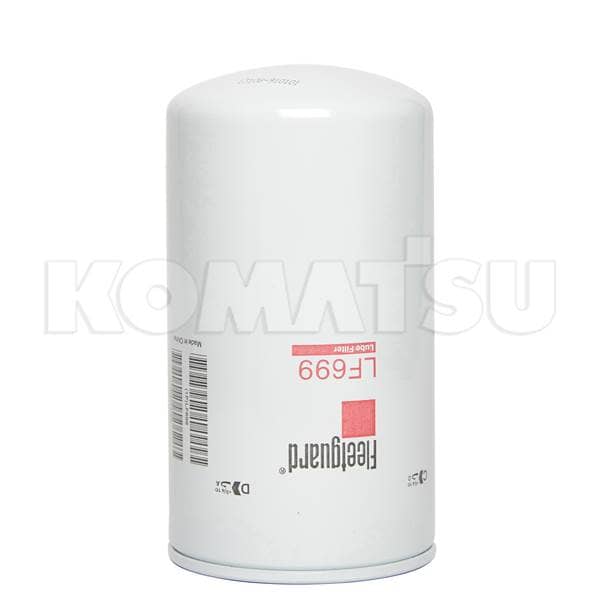 Engine Oil Filter, cylindrical shape, predominantly white with red and black text. Ensures reliability and ease of fitment for Komatsu machines. Meets Komatsu Engineering Standards.