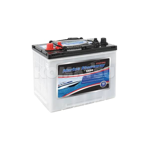 Marine Battery with dimensions 25.9 x 17.3 x 20.5 cm. Features red positive and black negative terminals, with a handle for easy carrying. Designed for marine use. Weighs 19.65 kg.