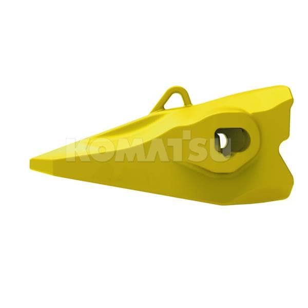 Yellow, pointed excavator bucket tooth with reinforced base and attachment hole. Suitable for heavy-duty digging or excavation. Weighs 92.0791 kg.