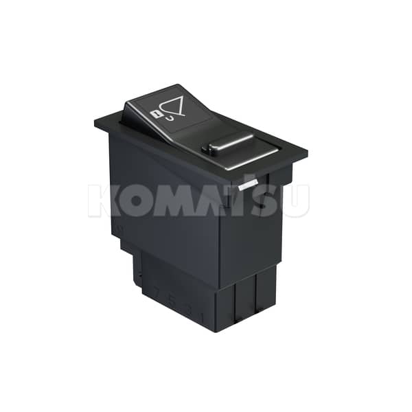 Black rectangular rocker switch with green indicator and white label. Fits multiple Komatsu Excavators models.