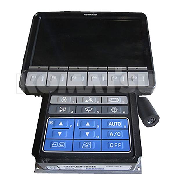 Monitor Panel Module with display screen and control buttons. Fits Komatsu models PC850-8E0, PC600LC-8E0. Designed to meet Komatsu Engineering Standards, exceeding ISO, JIS, and DIN standards.