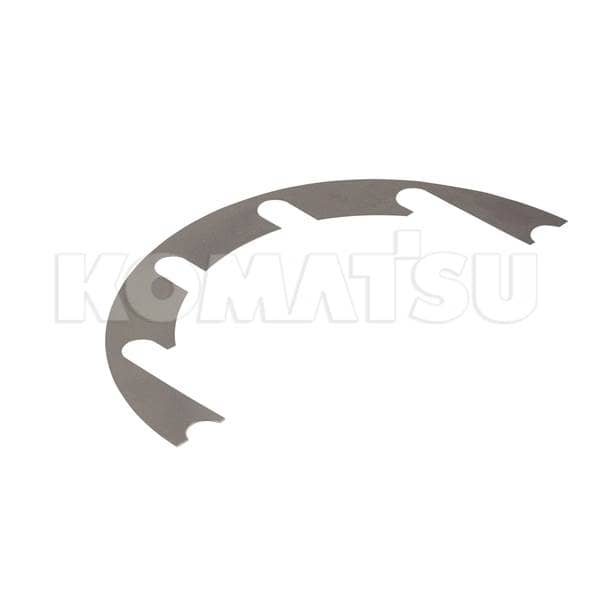 Metallic semi-circular shim with three inner edge cutouts. Dimensions 10.0 x 20.0 x 0.01 cm. Fits various Komatsu Wheeled Loaders.