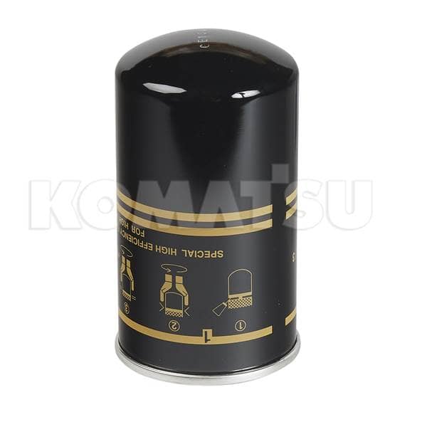 Black cylindrical fuel filter cartridge with gold-colored markings. Designed for optimal performance and longevity in Komatsu machines.