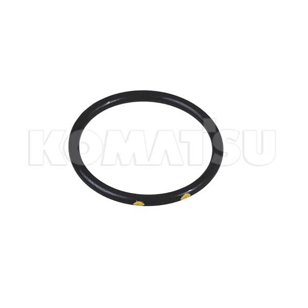 Black Rubber O-Ring with dimensions 10.3 x 14.1 x 1.6 cm. Temp Range: -20 to 160°C. ID Color: 2 Yellow Dots. Hardness: JIS HS 90 ± 5. Material: FKM-1E. Suits various Komatsu machines.