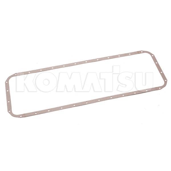 Rectangular Gasket with rounded corners and multiple holes for bolts or screws. Ideal for creating a seal between two surfaces in mechanical or automotive applications. Suits various Komatsu machines.