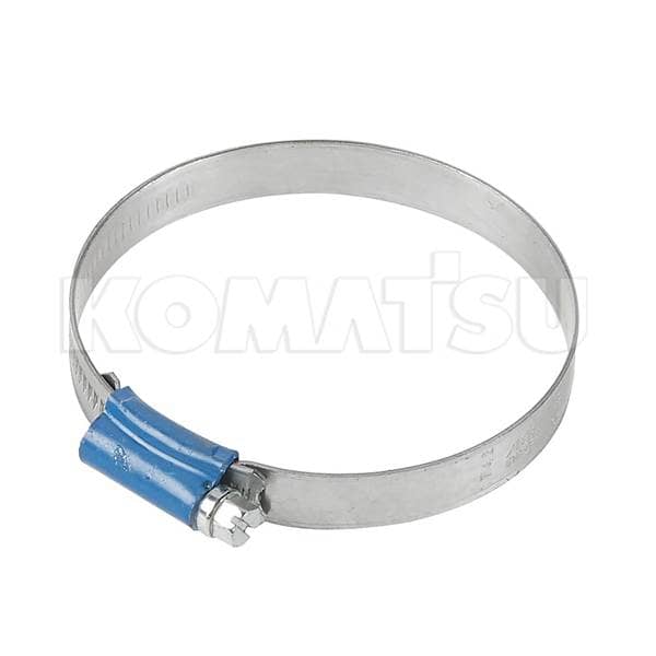 Stainless steel hose clamp with screw mechanism and blue protective cover. Fits Komatsu models WA270-3, WA320-3. Superseeded by item 07281-00809.