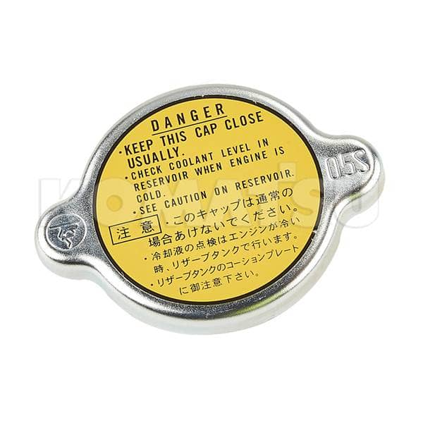 Radiator Cap with safety instructions in English and Japanese. Dimensions 23.2 x 22.0 x 3.8 cm. Fits various Komatsu Excavators.