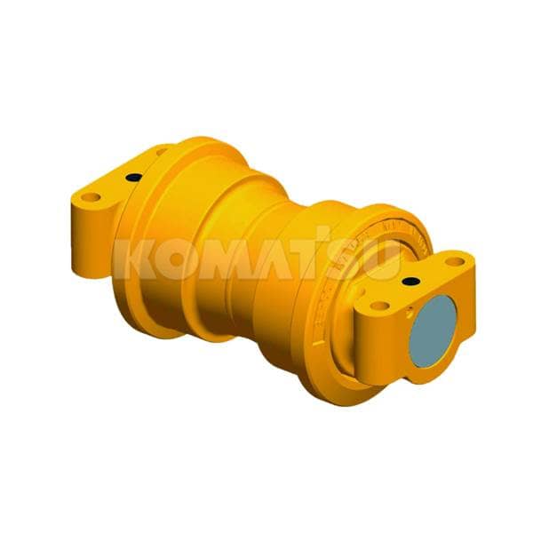 Yellow, cylindrical track roller assembly with flanges on both ends. Built for durability and heavy-duty use. Designed for Komatsu construction-class excavators in low impact, general excavation, and civil construction applications.